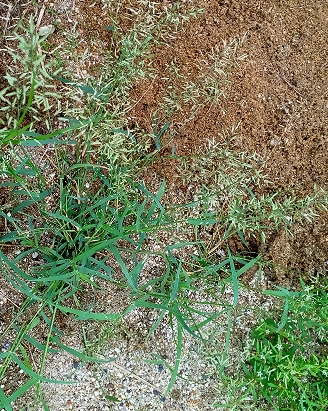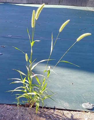 舗装された道路の継ぎ目からよく出ているのはエノコログサ、メヒシバが多く、このコスズメガヤもしつこくてんてんと生えています。